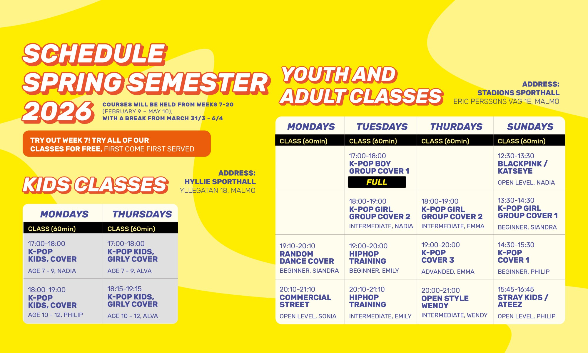 We have an open house on week 7 (9 – 15 of feb), where you can try all non-full classes completely free of charge!