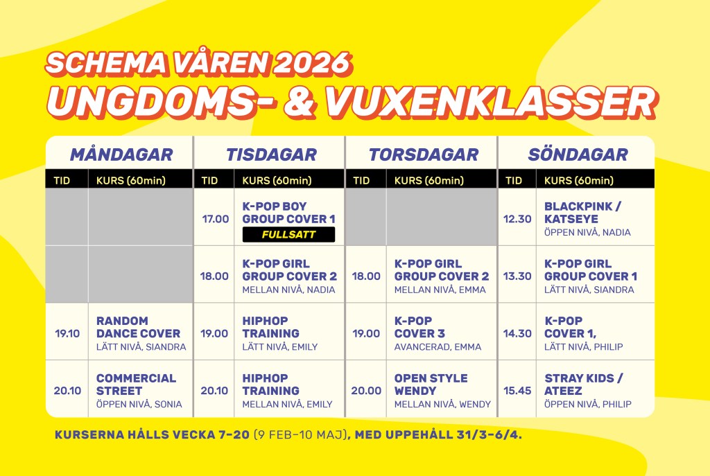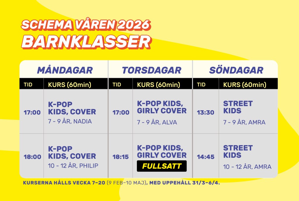 Nu erbjuder vi äntligen fyra K-pop-kurser för barn, uppdelade i två åldersgrupper: 7–9 år och 10–12 år. Under terminen får eleverna lära sig originalkoreografier från populära K-pop-låtar. Undervisningen anpassas efter gruppens nivå, och läraren kan även gå igenom förenklade versioner av danserna så att alla hänger med.