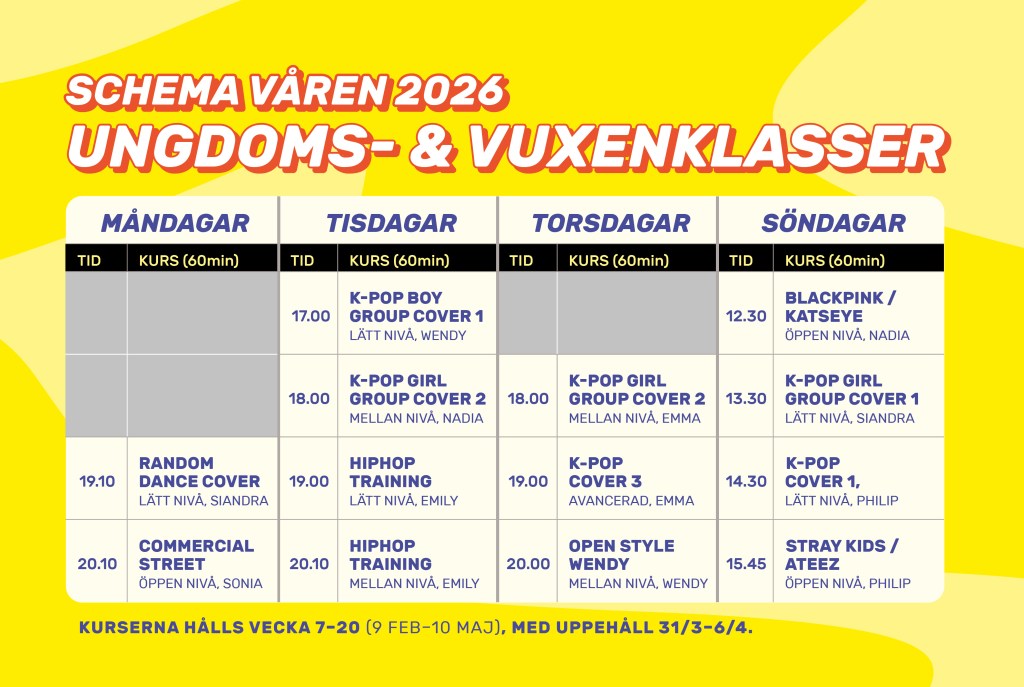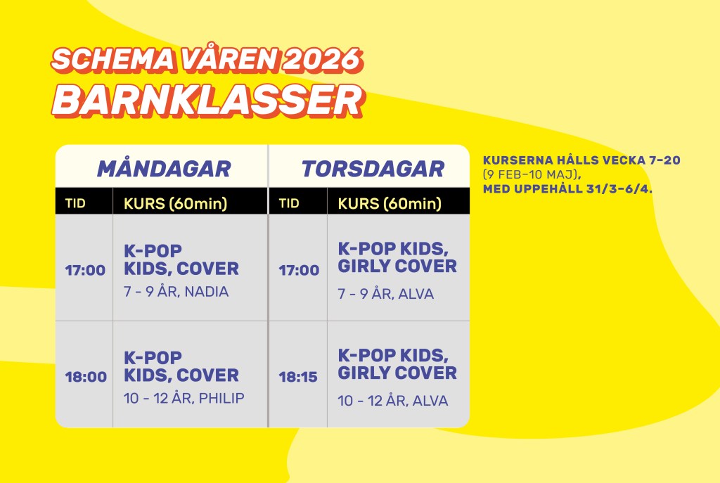 Torsdagarkl. 17:00–18:00: K-pop Kids, Girly Cover, 7–9 år *FULLkl. 18:15–19:15: K-pop Kids, Girly Cover, 10–12 år *FULL